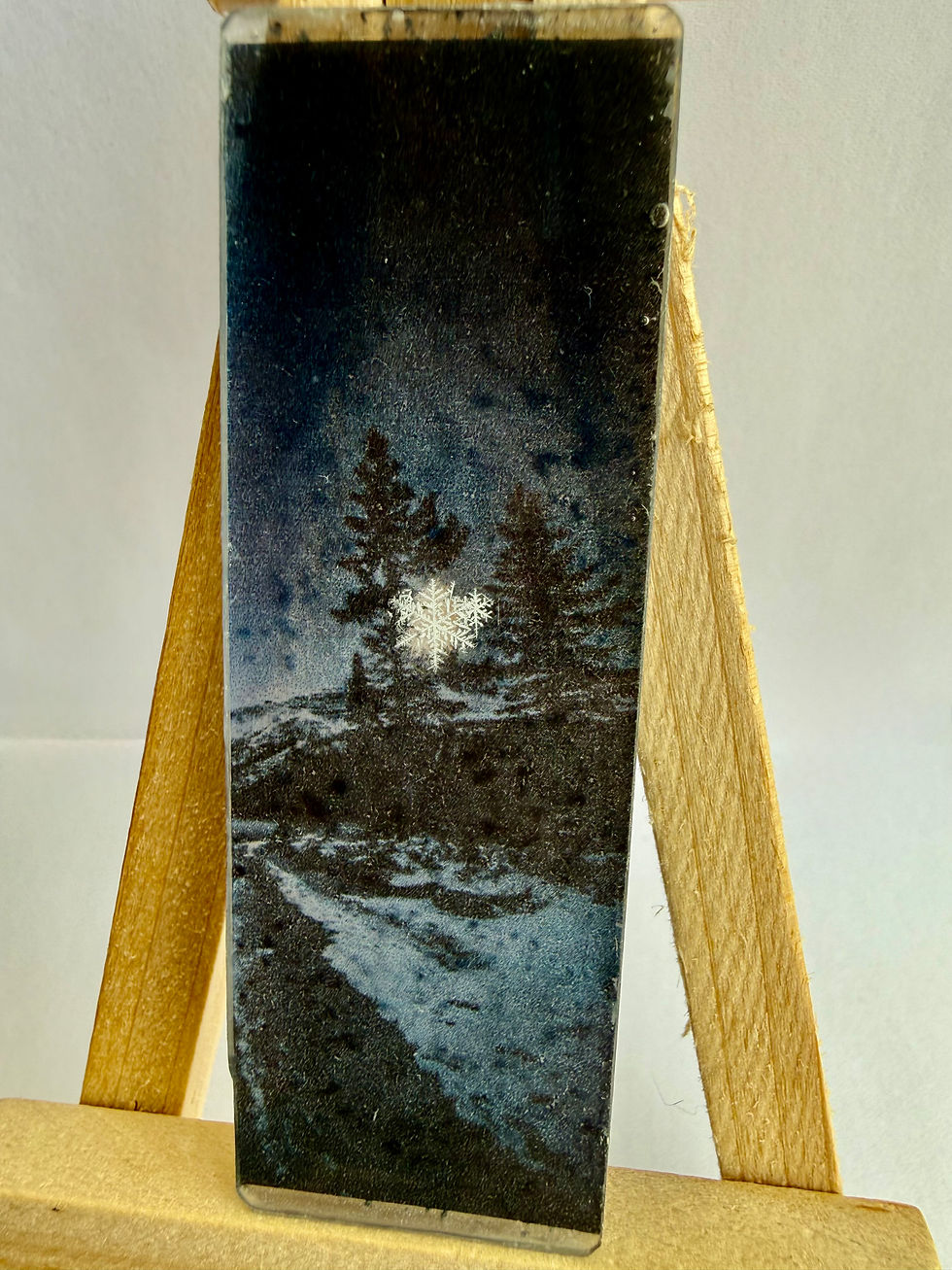 Not every storm brings beautiful snow crystals. Temperatures must be just right for snowflake collection! Snowflakes typically fall somewhere between sizes 6mm-15mm, depending on temperature and humidity. Glass magnification is then utilized to see all the beautiful details.